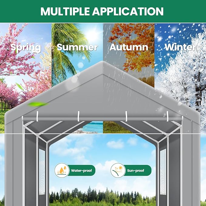 - 【Built to Last】 Constructed from 180g PE tarpaulin, this heavy-duty car canopy offers year-round protection against sun, rain, and dust for your vehicle or boat. It is securely attached to the frame with bouncy balls and stabilized with ground nails and wind ropes, providing reliable protection in all seasons.