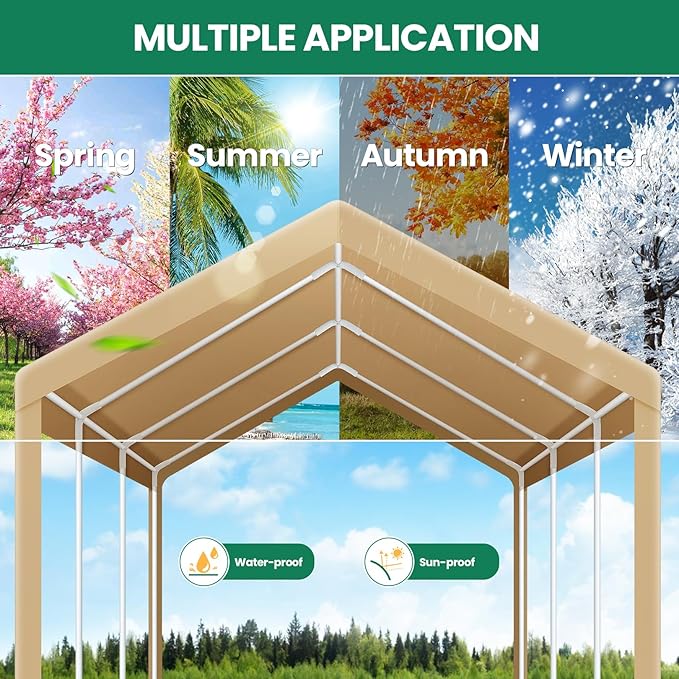 - 【Heavy Duty Structure】 10x20 carports feature a rust-resistant powder-coated steel frame, preventing chipping, peeling, rust, and corrosion. With 8 solid legs made of 1.5-inch galvanized steel pipes, this structure ensures enhanced safety and stability.