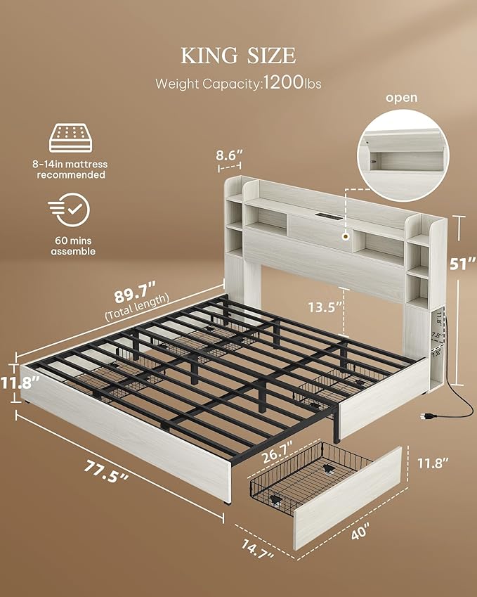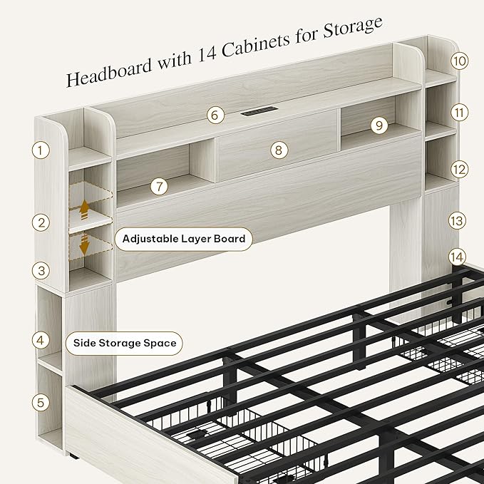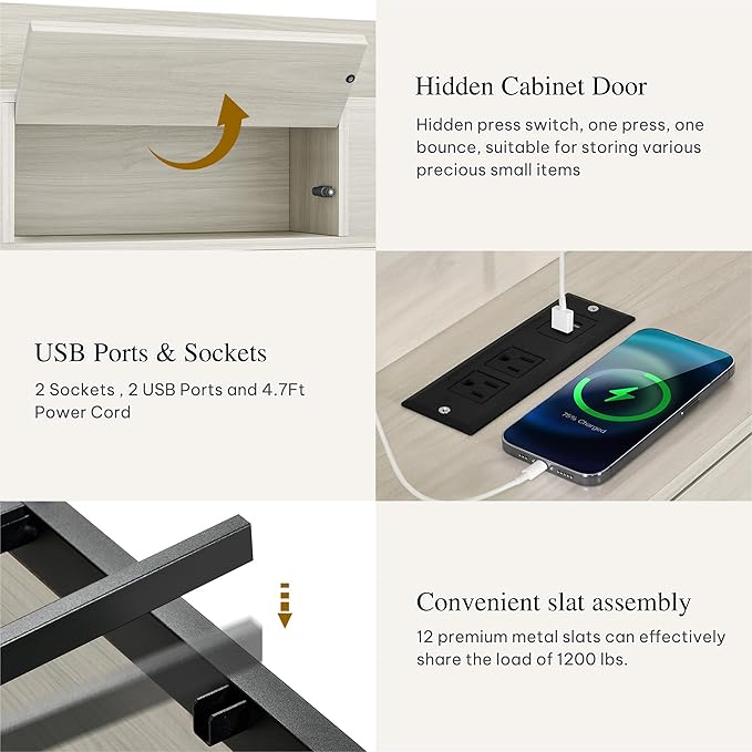 - BUILT-IN CHARGING STATION - The king size storage headboard bed frame built-in charging station, including 2 AC Outlets, a USB port and a type-C port, allowing you to charge various electronic devices within easy reach.