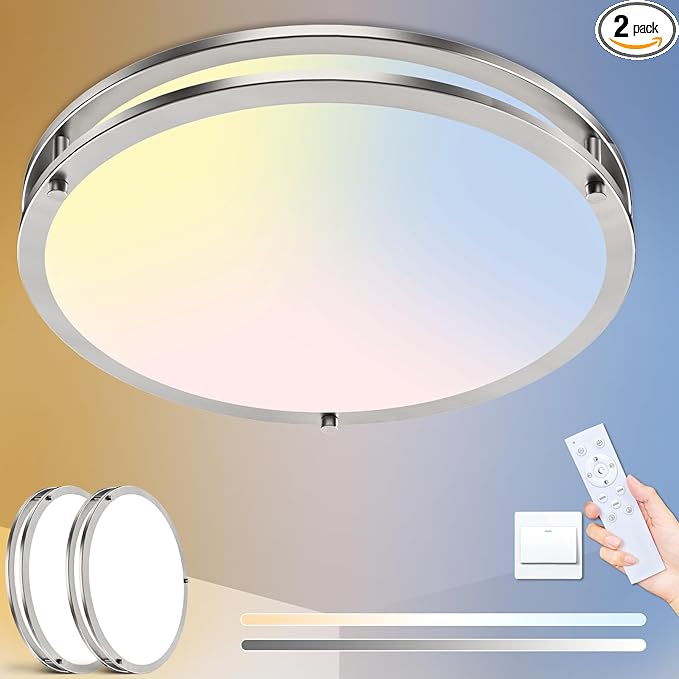 libtit 16Inch Flush Mount Ceiling Lights with Remote, 36W Dimmable LED Ceiling Light 3000K-6500K Adjustable, Large & Bright Brushed Nickel Light Fixture for Kitchen Bedroom LivingRoom -2Pack