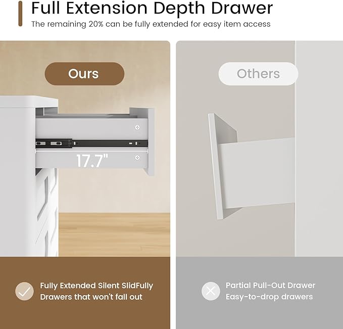- 【Extra Deep Drawers】This bedroom dresser features a spacious design with 20% deeper drawers. High-quality three-section slides allow the drawers to extend fully and prevent them from falling. Easily store a variety of clothing, accessories, and household items while keeping the space neat and organized.Drawer Dimensions: 17.7"D x 22.2"W x 5.5"H