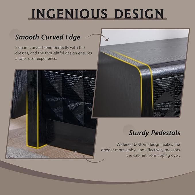 - GEOMETRIC DIAMOND-EMBOSSED DRESSER: Redefining functional elegance through clean geometry, this design pairs diamond-faceted drawers with wood panels joined at precise 45-degree angles, creating striking light-play that elevates visual drama. The modern luxury aesthetic is accentuated by signature metal handles - blending sculptural beauty with everyday practicality
