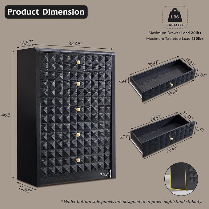 - STABILITY AND DURABILITY: Made from high-quality medium-density fiberboard (MDF) and P2-grade engineered wood. The base features a widened side panel design to enhance the stability of the nightstand. The tabletop can support up to 130 pounds, and the drawers can support up to 20 pounds. High-quality coating ensures that the dresser is easy to clean and wear-resistant, extending its service life