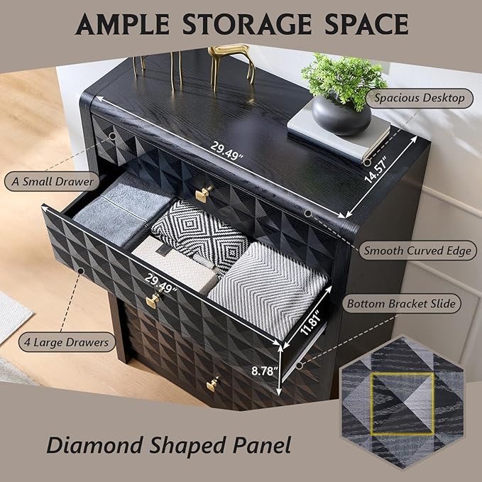 Modern 5 Drawer Dresser for Bedroom, Wooden Tall Dressers &Chests of Drawers w/Two Different Drawer Sizes, Mid Century Modern Dresser w/Diamond Panel Decorate for Bedroom, Curved Profile Design, Black