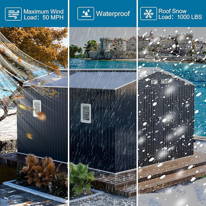 - Premium Durability & All-Weather: The metal storage shed is made from 0.25mm color steel plate & 0.6mm galvanized sheet. Includes reinforcement and 4 inland anchors, ensuring a solid overall structure capable of effectively resisting corrosion, oxidation, rain, and ultraviolet radiation. Lightweight and maintenance a breeze.