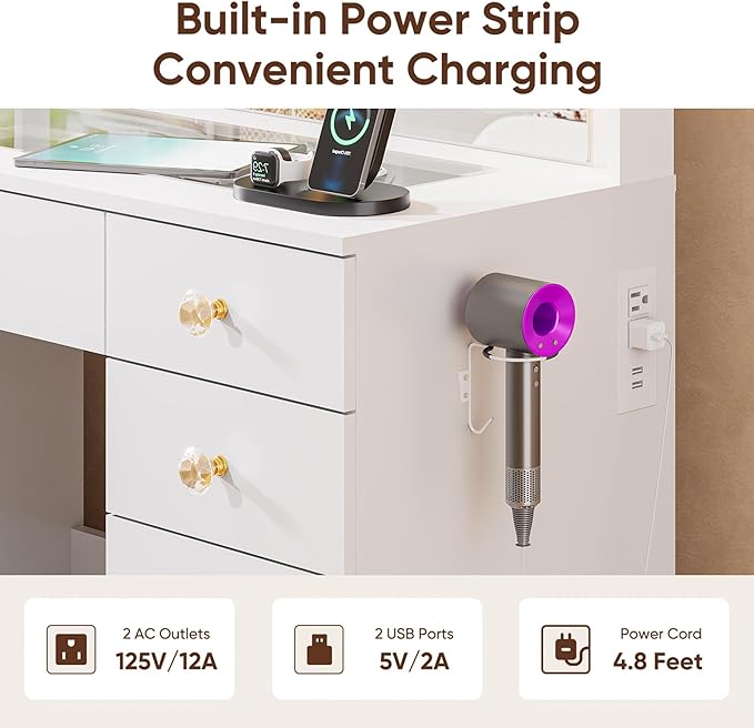 - 【Vanity Desk with Power Outlet】: This dressing table comes with power outlet, which contains two USB charging ports, which can charge your IPaid and mobile phone directly; And it includes two 120-volt AC charging outlets, so you don't have to search for a power outlet for your hair dryer anymore. The hair dryer and curling iron can be powered up at the same time, saving you time.