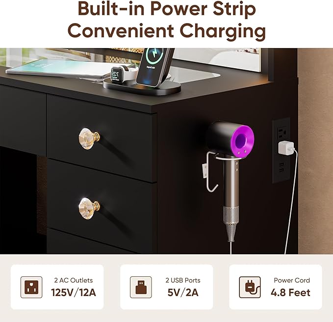 - 【Vanity Desk with Power Outlet】: This dressing table comes with power outlet, which contains two USB charging ports, which can charge your IPaid and mobile phone directly; And it includes two 120-volt AC charging outlets, so you don't have to search for a power outlet for your hair dryer anymore. The hair dryer and curling iron can be powered up at the same time, saving you time.