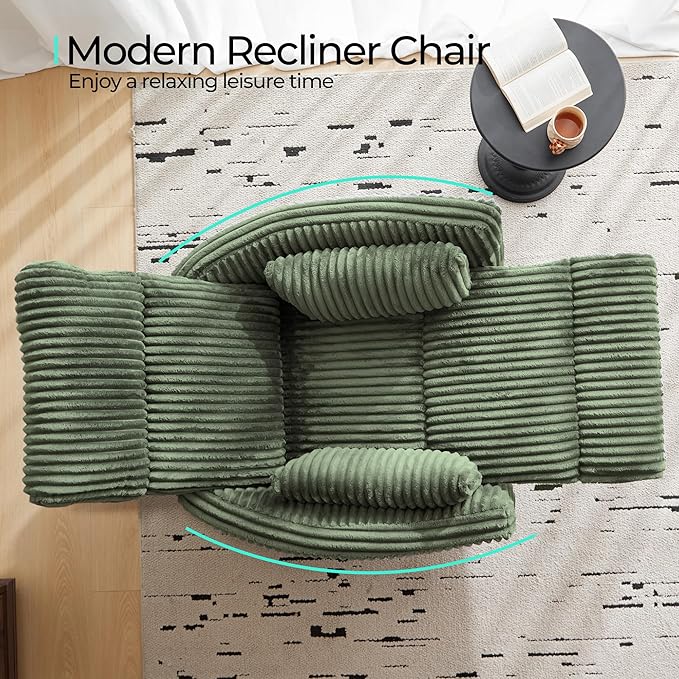 LINSY 360 Swivel Recliner Chair - Corduroy Nursery Glider Rocking Chair with 2 Pillows, Comfy High Back Adult Recliner for Small Spaces, Nursery Bedroom Living Room Reclining (Green)