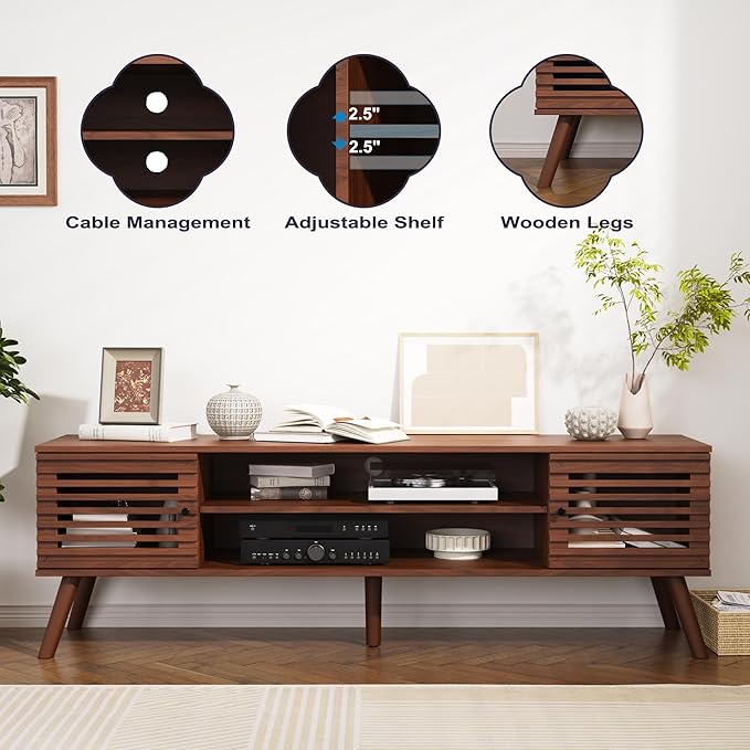 - 【Mid Century Modern Design】- This TV console beautifully blends vintage charm with contemporary design. Featuring slatted doors in a rich dark brown finish, it brings both elegance and cozy warmth to any space. More than just practical storage, it's a stylish statement piece that elevates living rooms and bedrooms alike