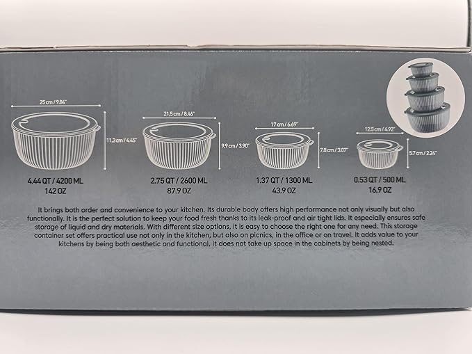 - Airtight & Leak-Proof Lids (8-Piece Set): This set includes 4 mixing bowls with lids (total 8 pieces) in sizes: 4.2L, 2.6L, 1.3L, and 0.5L. Perfect for storing leftovers, meal prep, or transporting food without spills. The tight-fit BPA-free lids prevent leaks, making this mixing bowl set ideal for home, fridge, and travel use.
