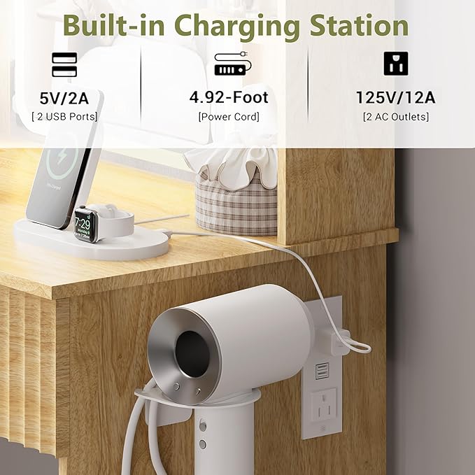 - 【CHARGING STATION】Compact vanity desk with charging station has 2 outlets and 2 USB ports, promotes efficiency by reducing cord clutter with a back cable hole, which make this vanity desk with mirror and lights can provide convenient charging options for your mobile devices and hairdressing tools.