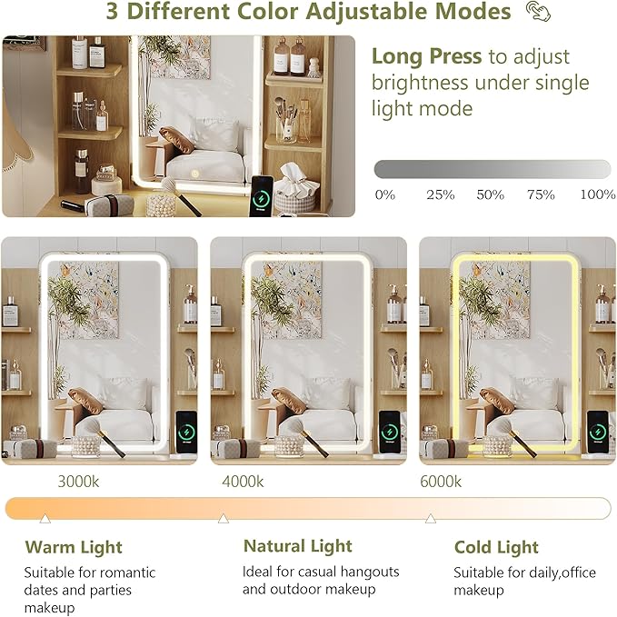 - 【VANITY MORRIR WITH LIGHTS】 The makeup vanity has equipped with an RGB LED lighting system, which can be controlled via APP or the switch.There are many static colors & dynamic modes and light flashing modes to create a beautiful ambiance. Fluted vanity desk with touch smart switch can be switched 3 different color temperature, adjusting the brightnes by long pressing the screen, which provides you with the perfect ambiance for your makeup and daily skin care.
