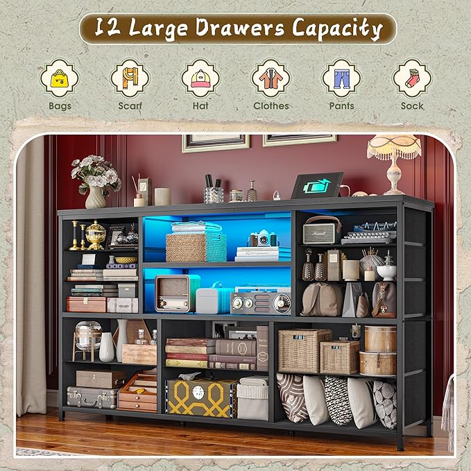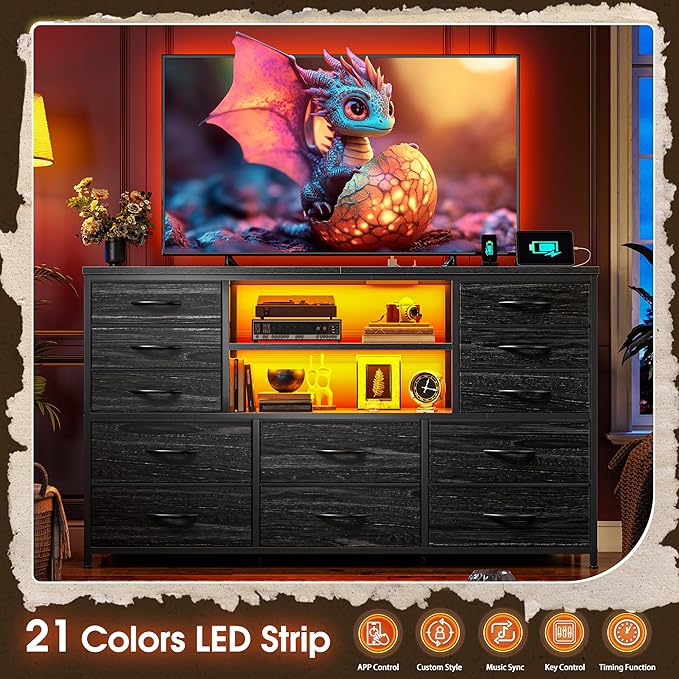 Black TV Stand with 12 Fabric Drawers for 55 inch TV, Entertainment Center with Charging Station & LED Lights, TV Media Console Table with 2 Open Storage Shelves for Living Room, Dorms, Wood Top