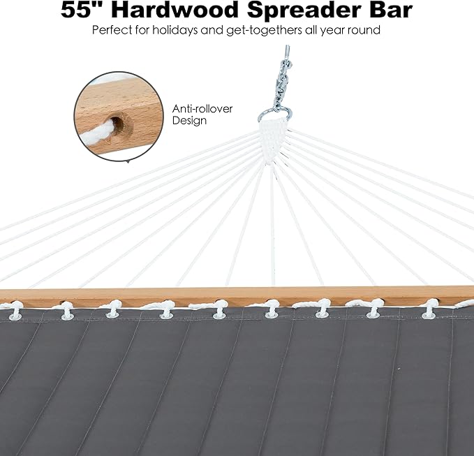 - ✅UPGRADED DOUBLE HAMMOCK & SPACIOUS ENOUGH TO SHARE: The comfort that comes with extra space is vital to us, and its size also boasts a wider range of versatility, allowing it to be hung from a 12-14ft hammock stand (not included) or used outdoors on its own.The hammock bed's dimension is 78.7" L * 55" W, the length from chain to chain is 14', larger than other quilted hammocks.