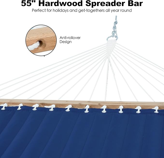 - ✅UPGRADED DOUBLE HAMMOCK & SPACIOUS ENOUGH TO SHARE: The comfort that comes with extra space is vital to us, and its size also boasts a wider range of versatility, allowing it to be hung from a 12-14ft hammock stand (not included) or used outdoors on its own.The hammock bed's dimension is 78.7" L * 55" W, the length from chain to chain is 14', larger than other quilted hammocks.
