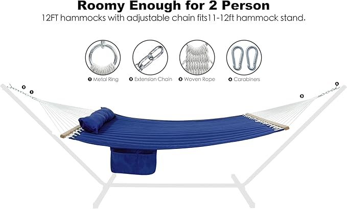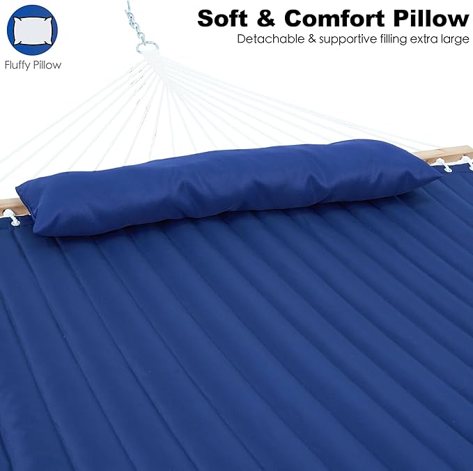 2 Person 12FT Hammocks for Outside, Double Quilted Fabric Outdoor Hammock with Spreader Bar, Large Removable Pillow, Storage Pockets, Carabiners, Max 475 lbs Capacity (Dark Navy)