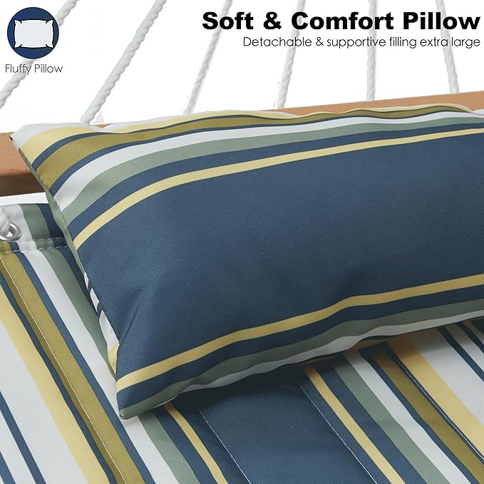 - ✅UPGRADED DOUBLE HAMMOCK & SPACIOUS ENOUGH TO SHARE: The comfort that comes with extra space is vital to us, and its size also boasts a wider range of versatility, allowing it to be hung from a 12-14ft hammock stand (not included) or used outdoors on its own.The hammock bed's dimension is 78.7" L * 55" W, the length from chain to chain is 14', larger than other quilted hammocks.