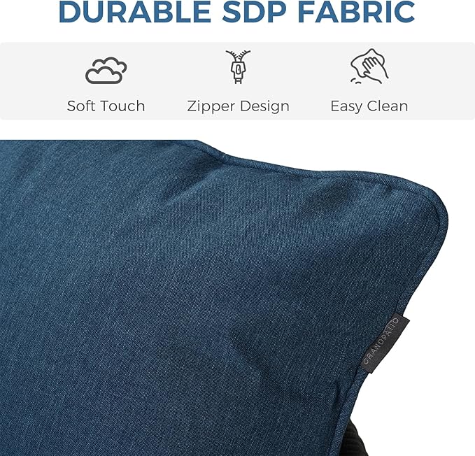 - THICKENED CUSHION: 230 grams of peacock blue SDP fabric. Soft and skin-friendly, fade-resistant, durable and adaptable to many kinds of outdoor weather. The dining chairs with 3.15-inch cushions provide an upgraded level of comfort.