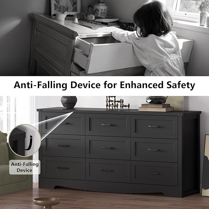 - 【Modern 9 Drawer Dresser for Bedroom & More】 Elevate your bedroom with this modern dresser that combines sleek design and ample storage. Measuring 15.75"D x 59.05"W x 29.52"H, it works perfectly as a dresser for bedroom, TV stand with storage, or closet dresser. The wide top offers space for décor, photos, or essentials, making it a versatile piece for any room.