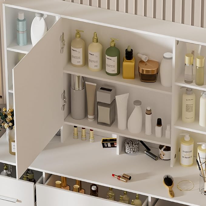 - 【Ideal for All Ages】The dimensions of this vanity desk are 140*100*40cm, offering a large tabletop and various sized drawers and display cabinets to accommodate different storage needs such as cosmetics, makeup brushes, hairdryers, and jewelry. The height of the vanity table and chair is designed to meet the mirror-viewing needs of both adults and teens, ensuring optimal usability of our product