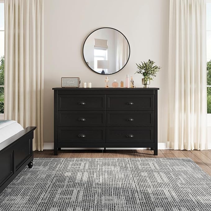 Black Dresser for Bedroom, Farmhouse 6 Drawer Double Dresser with Vintage Antique Handles, Modern Dressers and Chest of Drawers for Bedroom