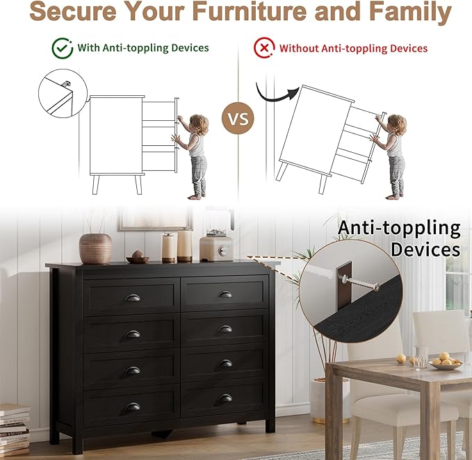 Black Dresser for Bedroom, Farmhouse 8 Drawer Double Dresser with Vintage Antique Handles, Modern Tall Dressers and Chest of Drawers for Bedroom