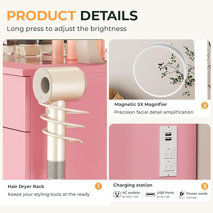 - 【Happy Experience】The pink vanity mirror with lights desk with storage contain all parts, detailed instructions and tools in one package. Recommended to follow every step in the instructions. If you have any questions about our products before or after purchasing, please contact us anytime and our friendly service team will get back to you within 24 hours.
