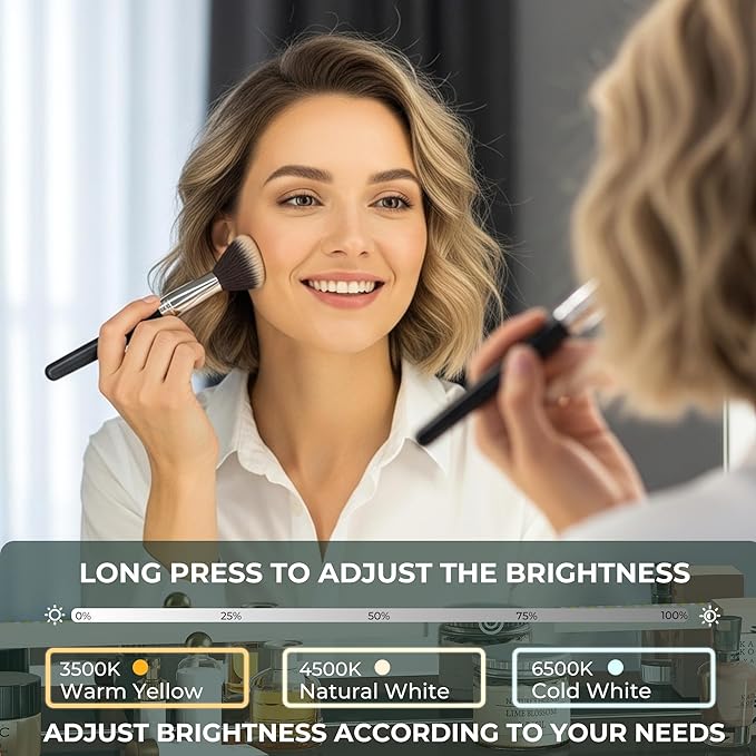 - 【Adjustable Light Mirrorr】Featuring an 46'' HD makeup vanity mirror with lights, this vanity with lights offers three adjustable lighting modes: warm yellow, warm white, and cool white. These settings help simulate different lighting environments, ensuring your makeup looks exceptionally beautiful in any environment.