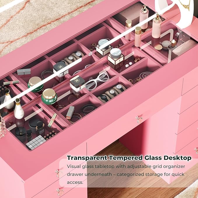 - 【Modern Minimalist Vanity Desk】This makeup vanity set displays 11 neatly arranged vanity organizer drawers. The transparent glass top, crystal handles and sleek pink vanity surface blend to achieve a stylish modern aesthetic. Accompanied by an oversized vanity mirror with lights, it radiates vibrant energy throughout your bedroom.