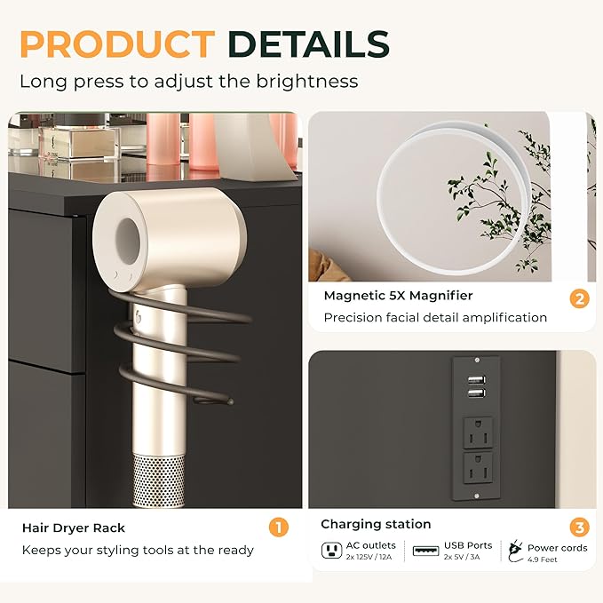 - 【Smart Convenience Solutions】This vanity mirror with lights integrates modern conveniences. The Magnetic 5X Magnifier for for Detailed Facial Viewing, while the built-in charging station powers your devices. A dedicated hairdryer stand keeps styling tools within reach, and the 3-section soft-close drawer slides ensure silent, wobble-free operation—all designed for a premium dressing experience.