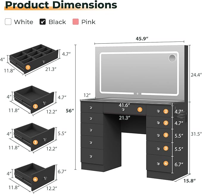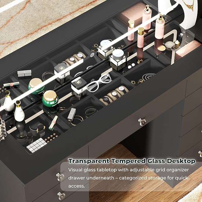 - 【Premium & High-Capacity】This stylish makeup vanity desk with lights is crafted with E1-certified panels and features scratch-resistant melamine surfaces, ensuring long-lasting durability and effortless upkeep.It includes 11 smooth-sliding vanity drawers and a spacious 46x12 inches glass top. The adjustable grid-organizer drawers beneath the glass top provide optimal product organization, our vanity desk can keep your area tidy and streamlined.