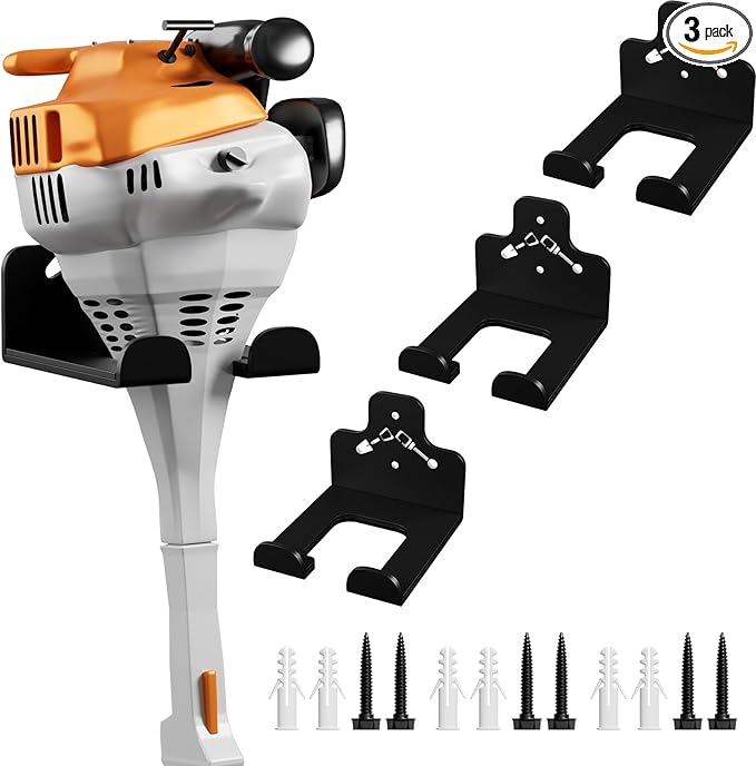 - Easy to Install: Only a few minutes is needed to install the weight bar storage to your wall, our weedeater hanger wall mounted for grass trimmer, hedge trimmer, garage trimmer, garden tools, the perfect tool saving space for your home and workplace,the trimmer hanger hook kit come with 1 racks, 2 screws and 2 expansion tubes.