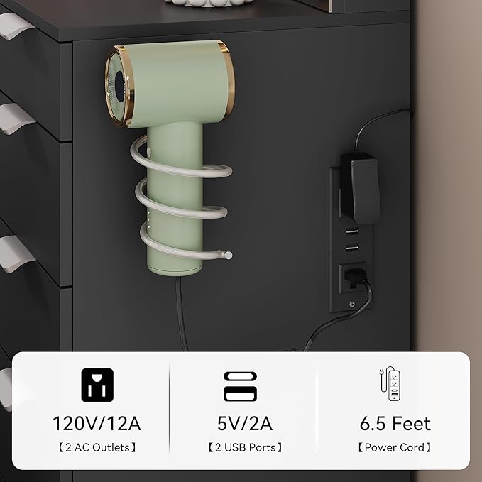- Integrated Power Hub: Designed for convenience, the makeup vanity includes two standard outlets, two USB ports, and a dedicated hair dryer holder, making it ideal for daily use in dressing rooms, salons, or streaming setups