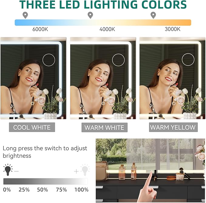 - Spacious LED-Lit Mirror: Experience flawless makeup application with the expansive 46''x24.4'' vanity mirror, illuminated by customizable LED lights offering three vibrant color modes, effortlessly adjusted with a gentle touch