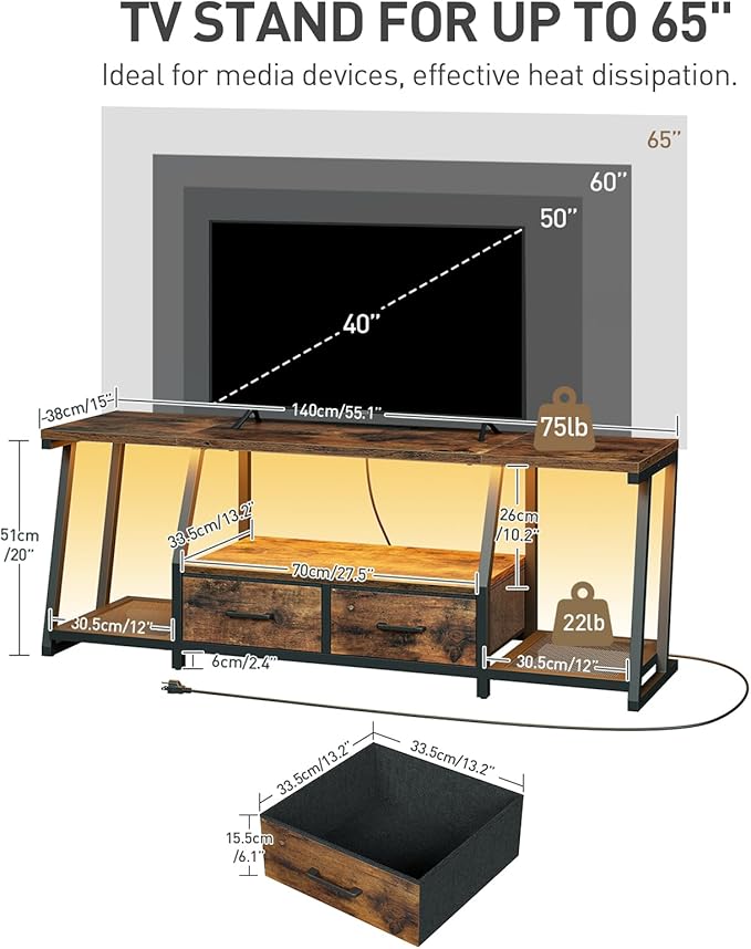 - Storage TV Stand: Sized 55.1”L x 15”W x 20”H, the TV cabinet fits most TVs for years, such as 50/55/60/65 inches TV. It features 2 cloth drawers for storing small items, making them easy to find. The mesh shelves on both sides are ideal for media devices, providing effective ventilation