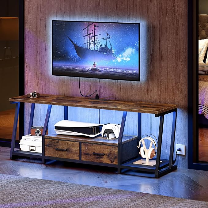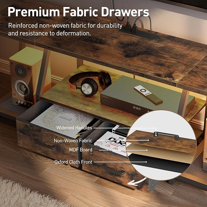 LED TV Stand with Fabric Drawers for 65 Inch TV, Entertainment Center with Power Outlets and Open Storage Shelves, Industrial Media TV Console Table for Living Room, Bedroom, Rustic Brown