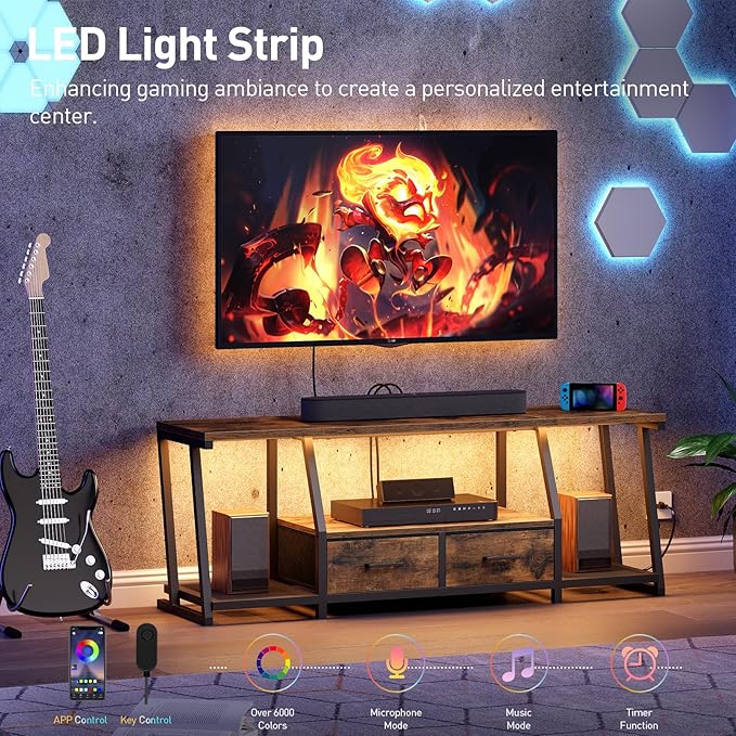 - LED Light Strip: The TV console table comes with a unique light strip with a wide range of colors, 12 modes, 5 speeds, 3 brightness levels, and a timer function. Control it easily with a remote or mobile app to create the perfect ambience for your media center