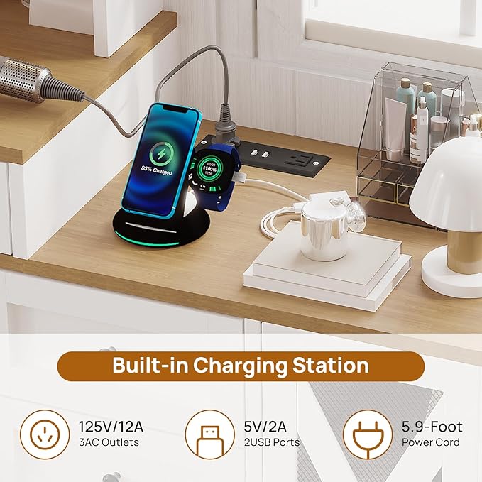 - Equipped with 2 built-in USB ports and 2 AC outlets on the side cabinet, this vanity table lets you effortlessly plug in your blowdryer, curling iron, or charge your phone, tablet, and other devices—no more searching for distant power sockets while styling or getting ready. Blending functionality with daily convenience, it’s far more than just a vanity; it’s a practical companion that simplifies your routine.