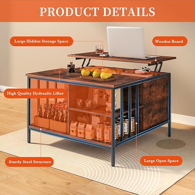 - 【Functional Lifting Top Design with Safety Features】 Measuring 31.5"*31.5"*20.3", this farmhouse coffee table can be effortlessly lifted to a height of 26 inches, providing a convenient surface for impromptu work, dining, or browsing. When closing the lift top, a built - in buffer ensures a smooth and slow descent, preventing accidental pinching of fingers.