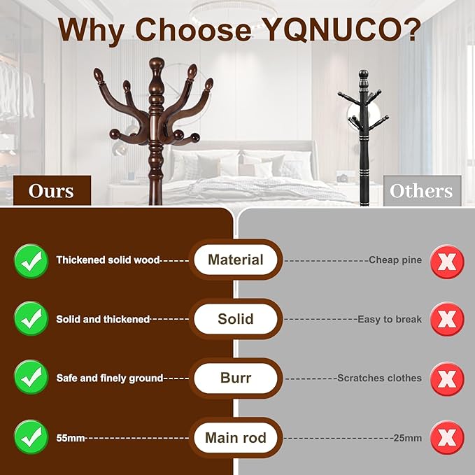 - AAA LEVEL BIRCH WOODEN MATERIAL: This coat rack is crafted from high quality solid birch wood, ensuring durability and a sturdy structure capable of holding your clothes and items without wobbling. The freestanding coat rack’s double-thickened, round base offers excellent stability. It’s a reliable choice that brings both steadiness and elegance to your home!