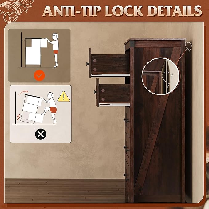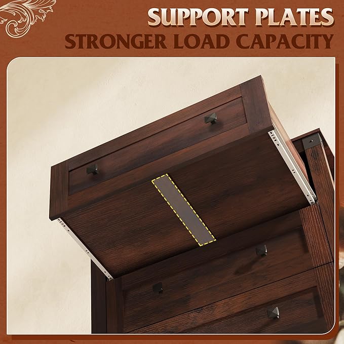 - 🎄【Farmhouse 5 Drawers Dresser】This wooden dresser farmhouse look is heightened by the rustic color finish coupled with the side barn sign and the dark square handle adds a rustic charm. It can be used for bedroom clothing organizer, entryway table, decorative storage for living room.