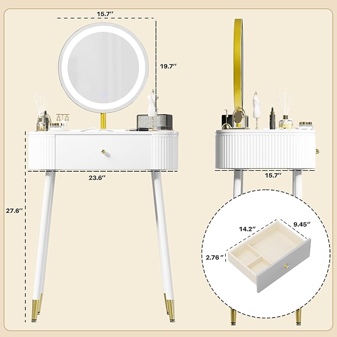- 【High-Quality Materials】Crafted with high-density eco-friendly boards, this small vanity desk is stable and built to last. The heat- and stain-resistant, anti-fingerprint surface makes cleaning effortless, and the smooth, silent drawer slides keep your daily routine pleasant.
