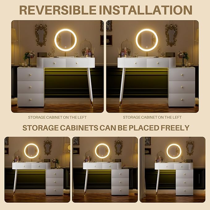 - 【3-Color LED Mirror with Smart Touch】Built-in with 168 LED beads, this vanity desk with mirror and lights offers three color temperature modes—warm, natural, and cool, you to adjust the brightness of the lights.Whether morning or night, this modern makeup vanity ensures perfect lighting for every moment.