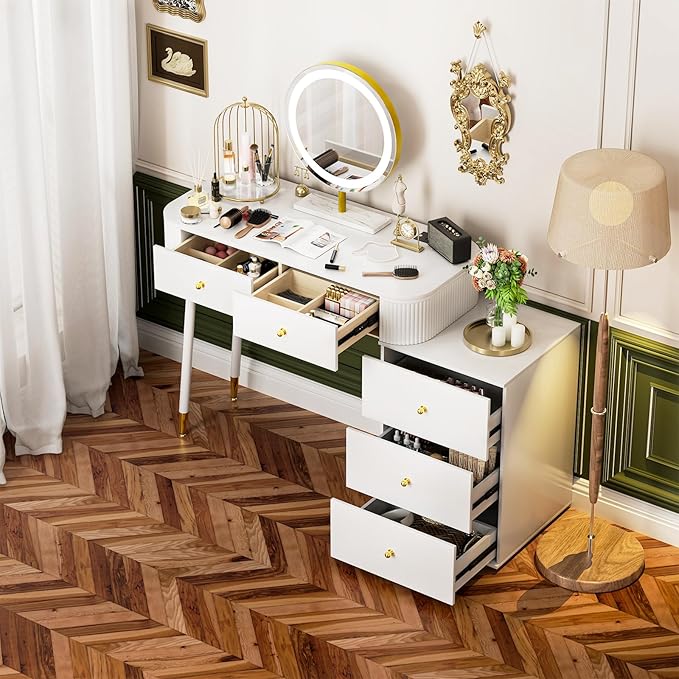- 【High-Quality Materials】Crafted with high-density eco-friendly boards, this small vanity desk is stable and built to last. The heat- and stain-resistant, anti-fingerprint surface makes cleaning effortless, and the smooth, silent drawer slides keep your daily routine pleasant.