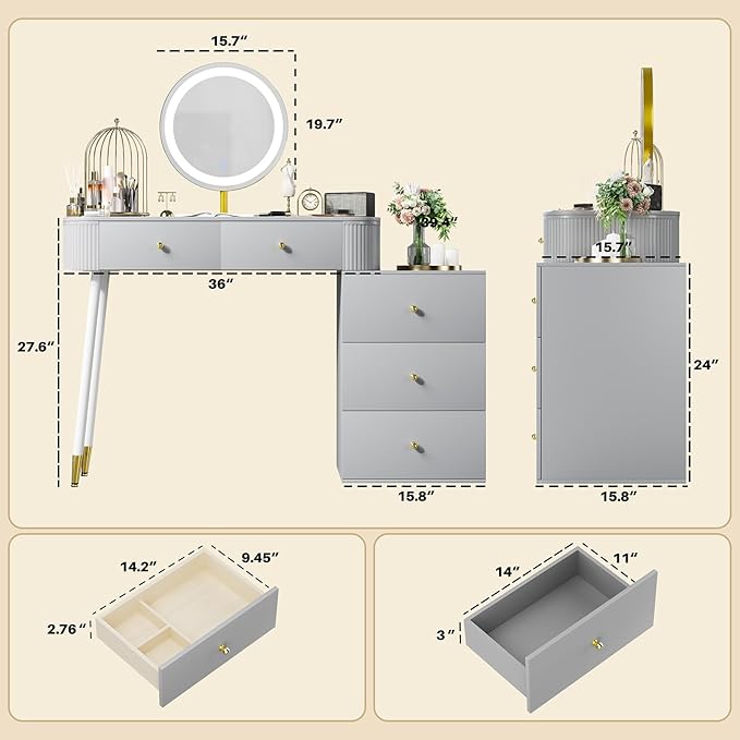 - 【Generous Storage Capacity】This 36 -inch vanity set offers abundant and practical storage space. Two large drawers with dividers are ideal compartments for storing trinkets, jewelry, or makeup tools for easy categorization. Three additional drawers keep everything neat and organized so you can quickly find what you need when getting ready.