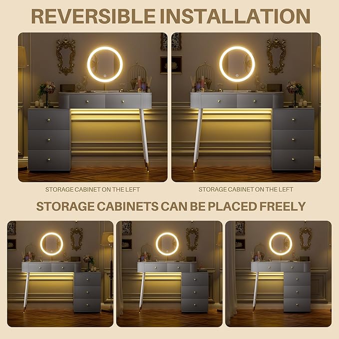 - 【3-Color LED Mirror with Smart Touch】Built-in with 168 LED beads, this vanity desk with mirror and lights offers three color temperature modes—warm, natural, and cool, you to adjust the brightness of the lights.Whether morning or night, this modern makeup vanity ensures perfect lighting for every moment.