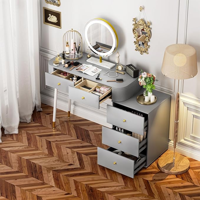 - 【High-Quality Materials】Crafted with high-density eco-friendly boards, this small vanity desk is stable and built to last. The heat- and stain-resistant, anti-fingerprint surface makes cleaning effortless, and the smooth, silent drawer slides keep your daily routine pleasant.