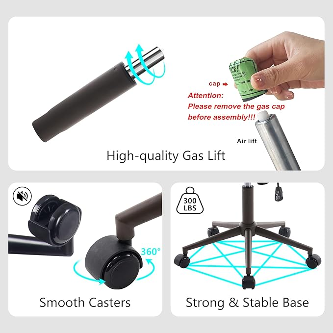 - 【Quick 4-Screw Assembly】Includes clear instructions for a 5–10 minute setup. Remove the plastic gas rod cap before use. See product video for guidance and enjoy your new armless office chair without hassle
