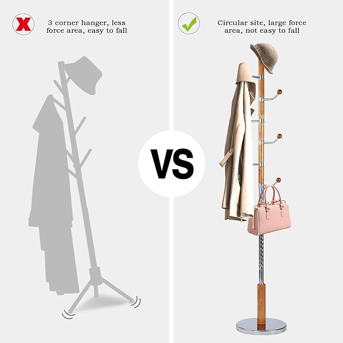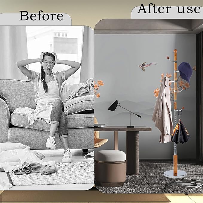 - 【Assembly Is a Cinch】Do you have trouble with complicated assembly?The wooden tree coat rack stand not have complicated installation, All you need to do is attach the pole onto the round base, then put the other details together. Even girls or old people can easily install this product. Can be assembled in under 10 minutes, helping keep your home a frustration-freestanding zone without unnecessary.