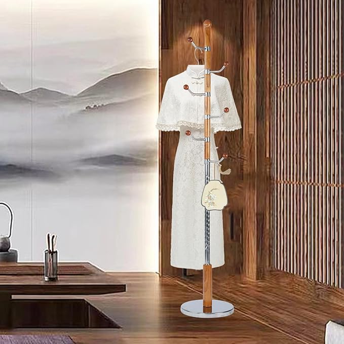 - 【CLASSIC EUROPEAN STYLE】The wooden coat tree is designed in a luxurious European style, with a simple structure and comprehensive functions. adopts natural birch tree, with high density and strong texture. The main body of the clothes hanger is made by drilling holes on a lathe, and after repeated manual grinding, and it can be hung without damaging clothes.